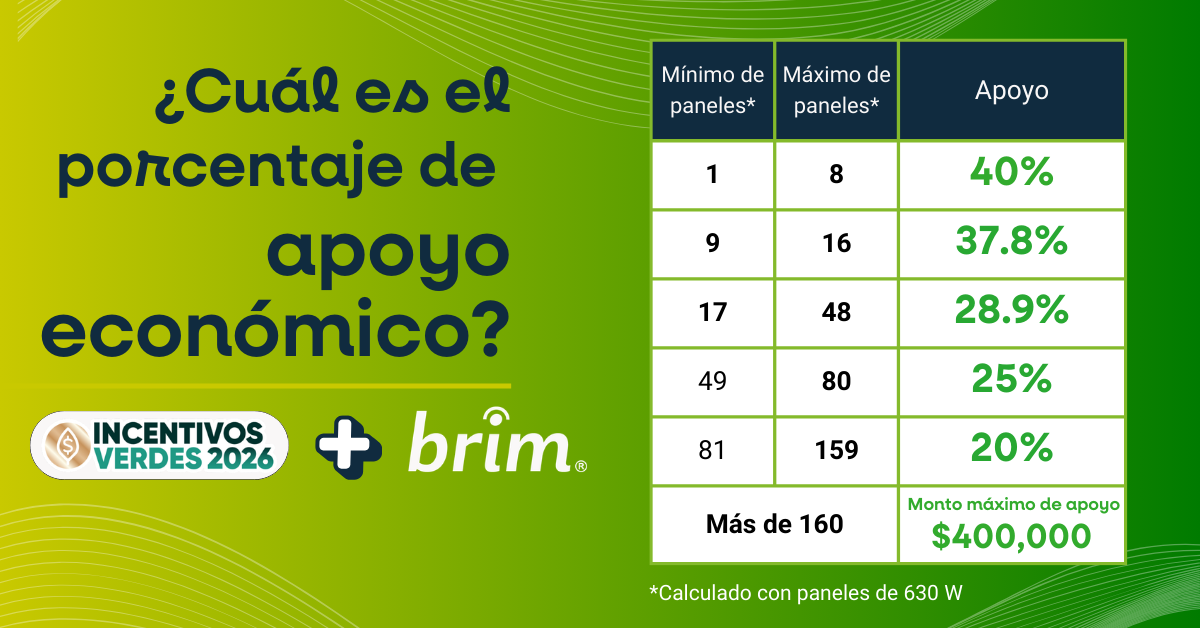 Aprovecha el programa Incentivos Verdes Puebla 2026. En Brim evaluamos tu perfil, armamos tu expediente y gestionamos el trámite ante la Agencia de Energía. ¡Hasta $400,000 MXN de apoyo!